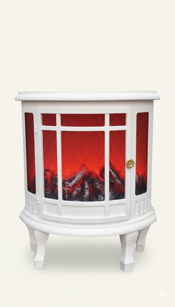 Antique White Curved LED Fireplace Stove–Realistic Flickering Flame Lantern, Decorative Electric Log Burner for Home Ambiance