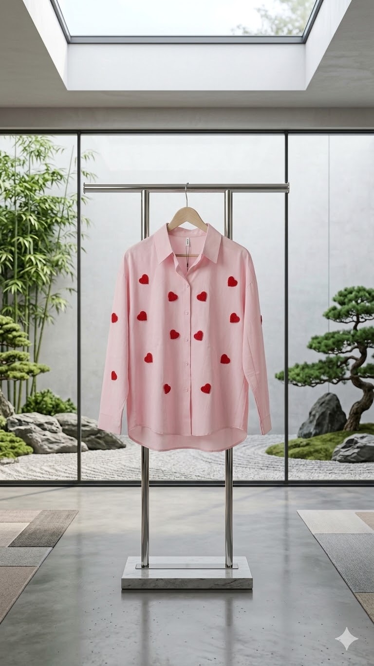 Baby Pink Heart-Embroidered Long Sleeve Oversized Shirt for Women.
