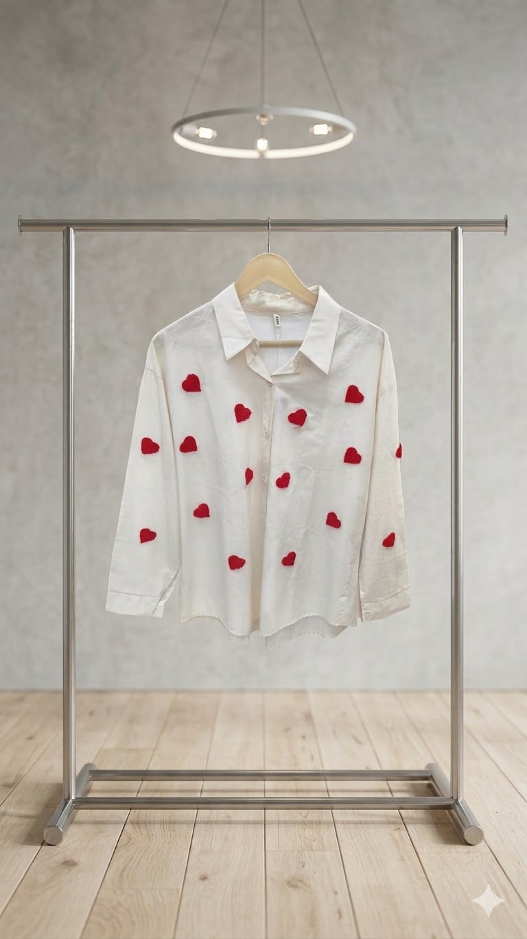 Classic White Cotton Shirt with Contrast Red Heart Embroidery.