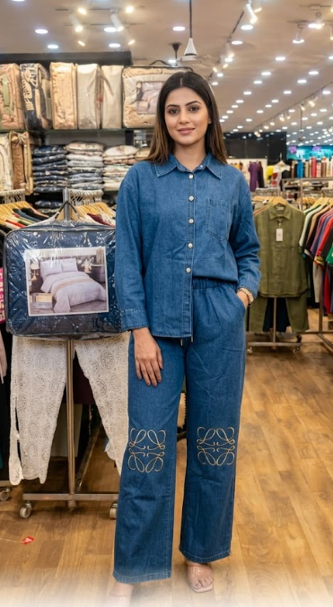 Co-ord Set: Soft-Wash Button-Down Shirt with Embroidered Geometric Motif Wide-Leg Trousers"