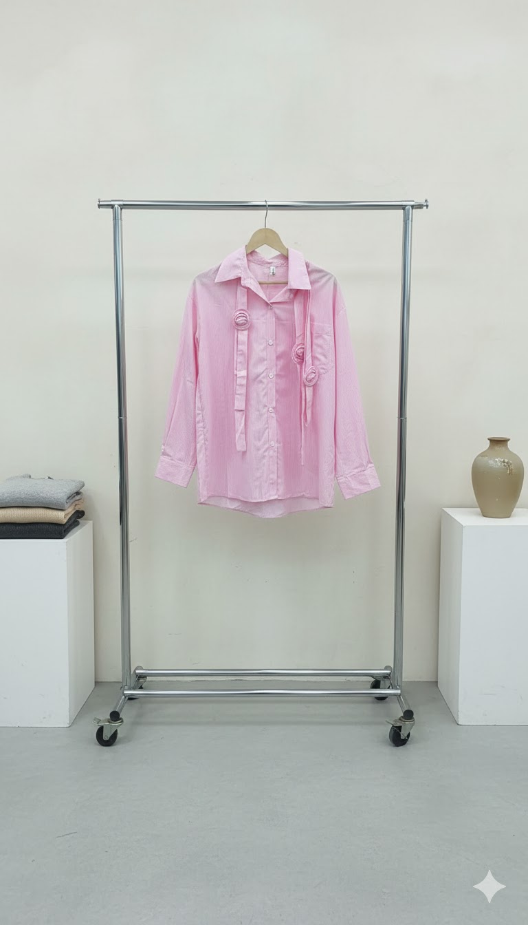 Designer-Inspired Pastel Pink Striped Statement Shirt with Triple Rosette Accents and Long Sleeves.