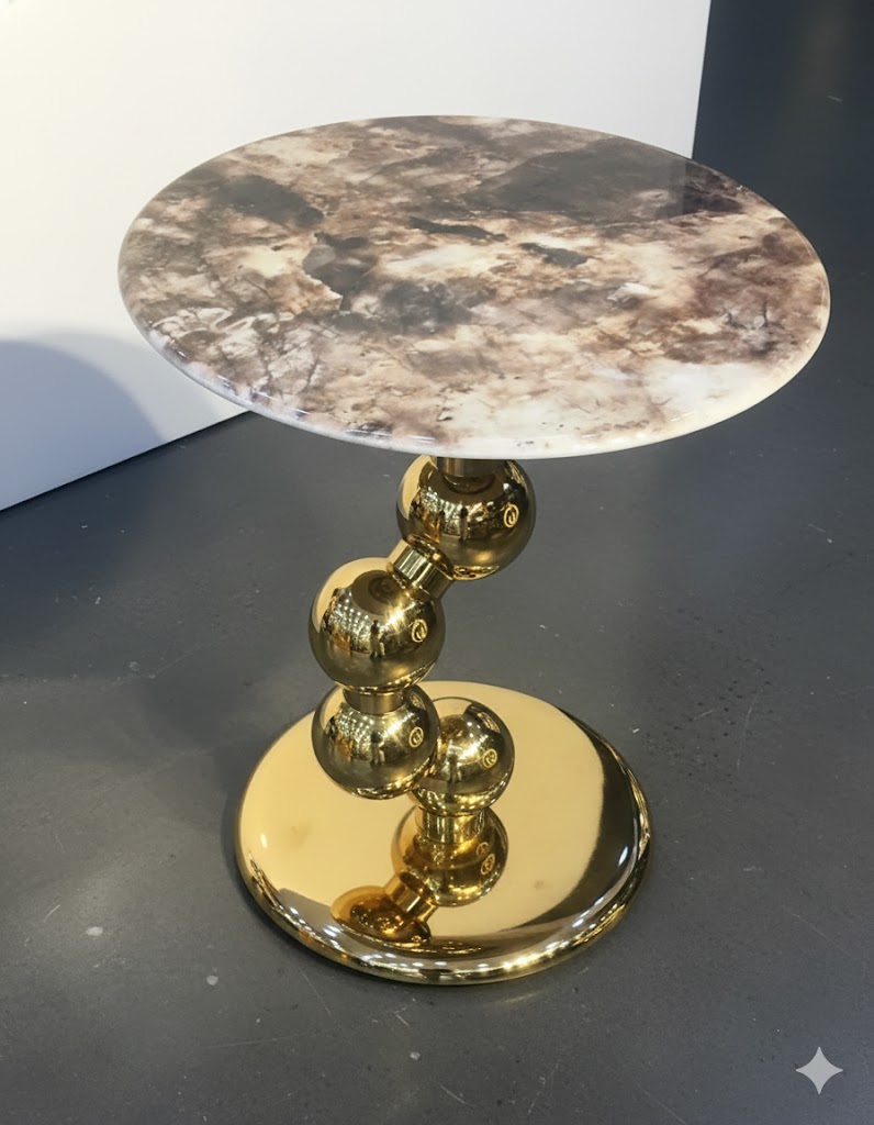 Luxury & Elegant Auric Marble Top Pedestal Side Table – Modern Sculptural Gold Sphere Base End Table for Luxury Interiors.