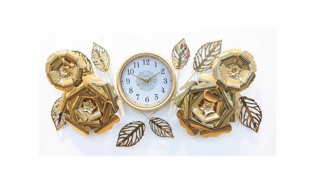 Luxury Golden Floral Metal Wall Clock with Decorative Roses .