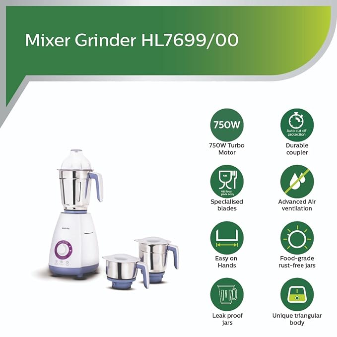 Philips HL7699/00 750-Watt Mixer Grinder 2-years warranty on product 5-years warranty on motor