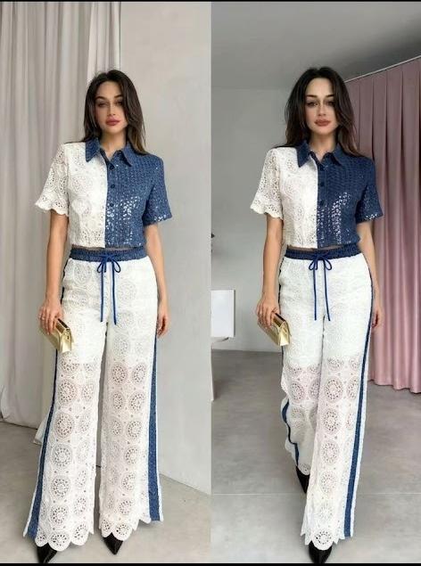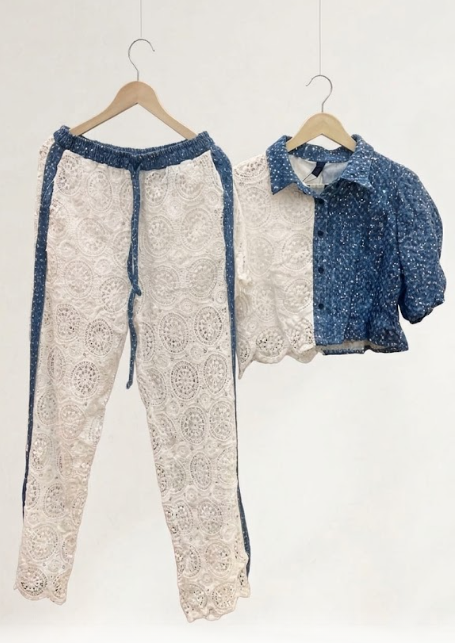 Premium Cotton Lace and Indigo Denim Fusion Two-Piece Co-ord Set with Cropped