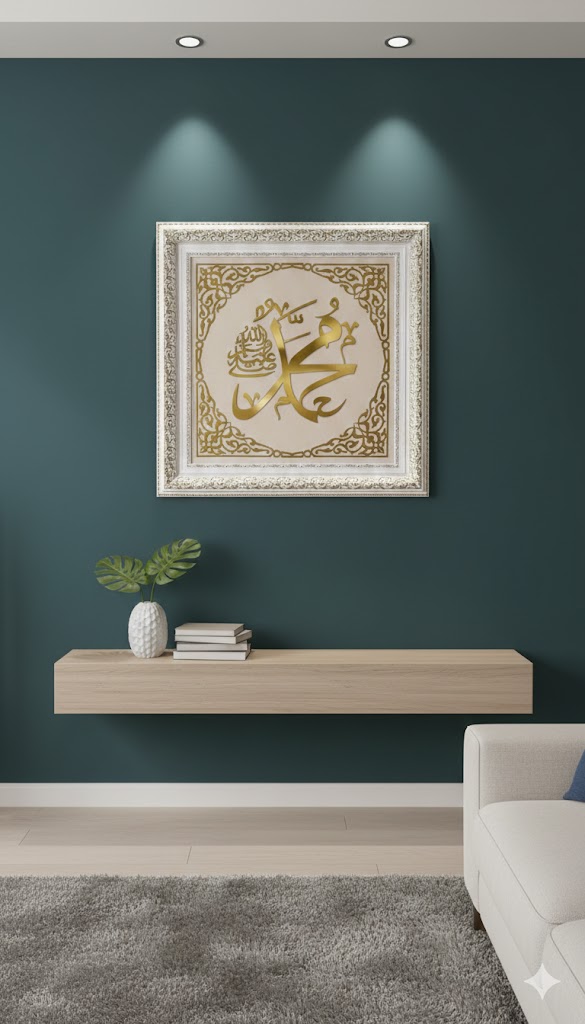 "Premium Islamic Wall Decor – Prophet Muhammad (SAW) Name in Golden Arabic Calligraphy, High-Gloss Finish, Square Frame for Living Room.