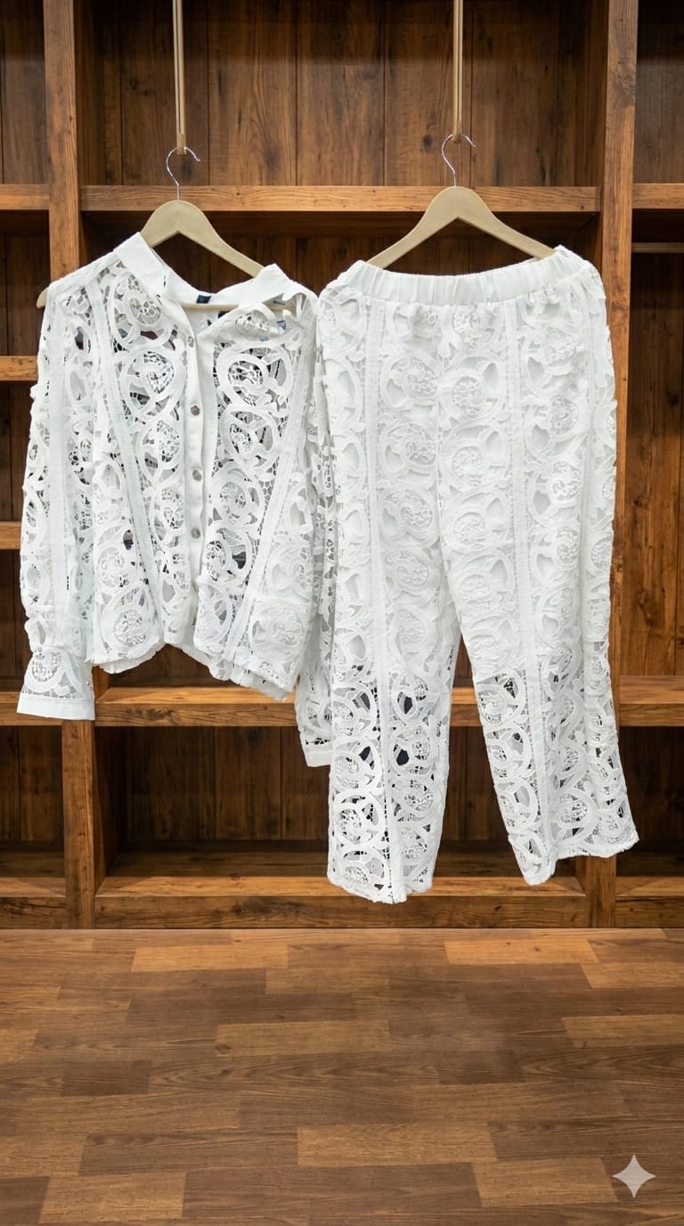 Premium White Geometric Lace Two-Piece Set – Oversized Shirt & High-Waist Flared Pants.