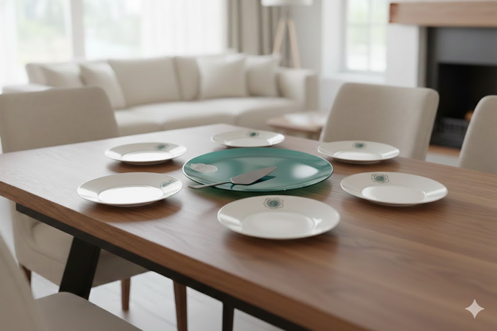 Premium Aesthetics: Deep emerald green platter aur crisp white dessert plates ka ek shandaar combination jo aapke dining table ko royal look deta hai.