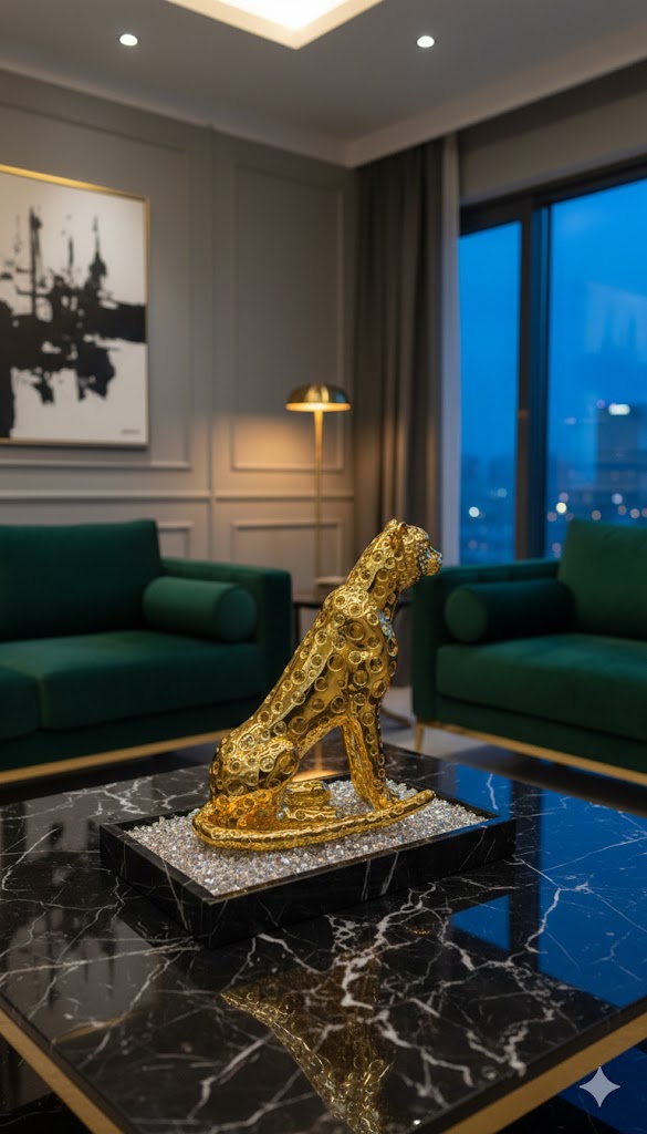 Royal Golden Leopard Statue – Premium Wild Animal Showpiece with Glittering Crystal.