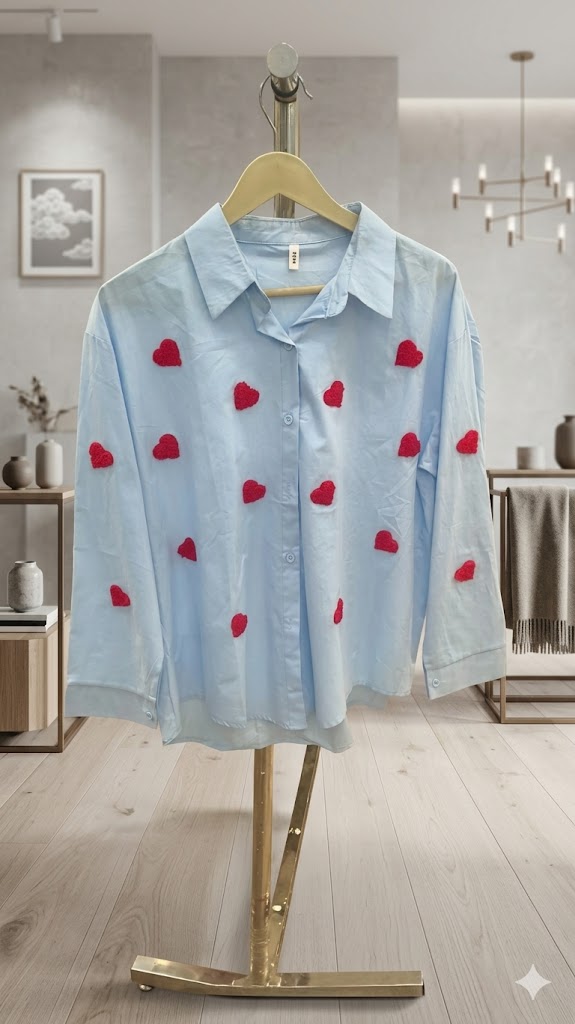 Sky Blue Heart Embroidered Long Sleeve Casual Shirt for Women.