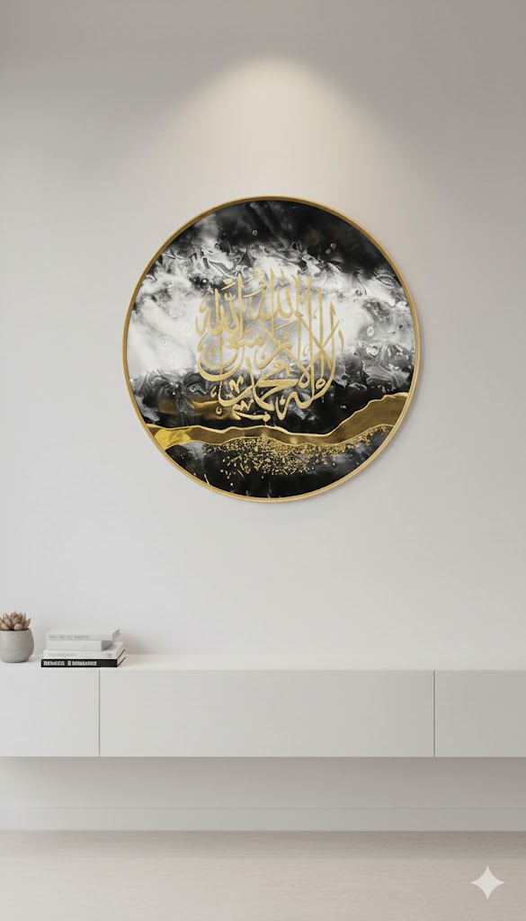 Premium Calligraphy : Ismein “La Ilaha Illallah Muhammadur Rasulullah” (Kalima Tayyaba) ko sunehri (gold) Thuluth script mein bahut safai se likha gaya hai.