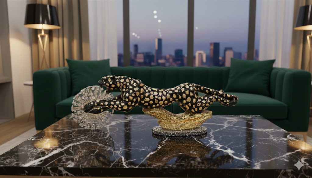 The Stealth Predator: High-Gloss Black & Gold Cheetah Art Piece – Luxury Tabletop Sculpture for Executive Office & Living Room