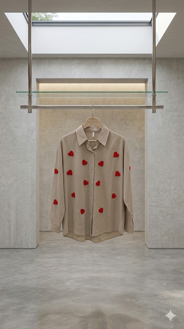 Warm Beige Heart-Embroidered Oversized Casual Shirt for Women.