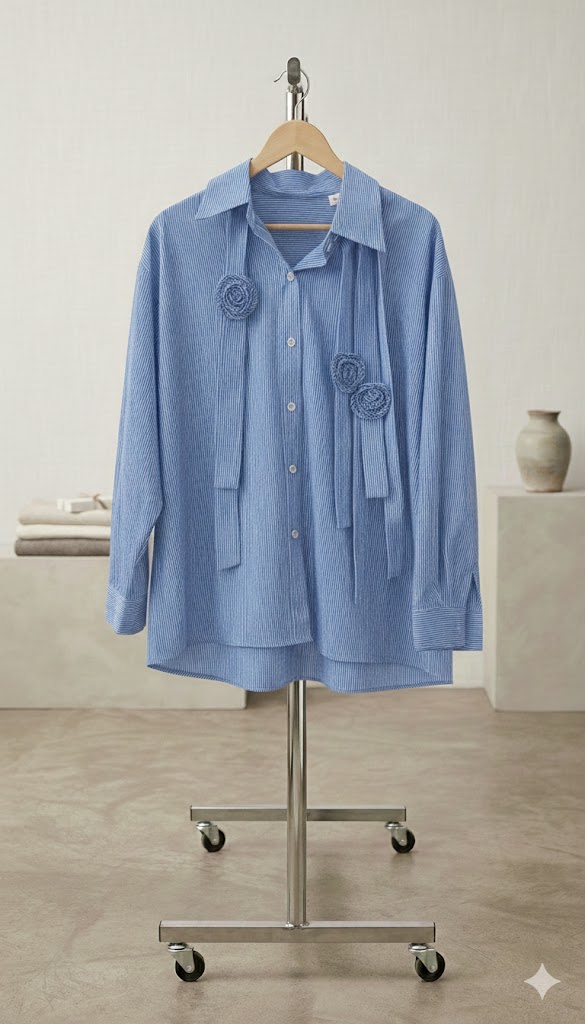 Women’s Premium Blue & White Striped Oversized Shirt featuring Hand-Crafted Rosette Embellishments and Classic Collar.