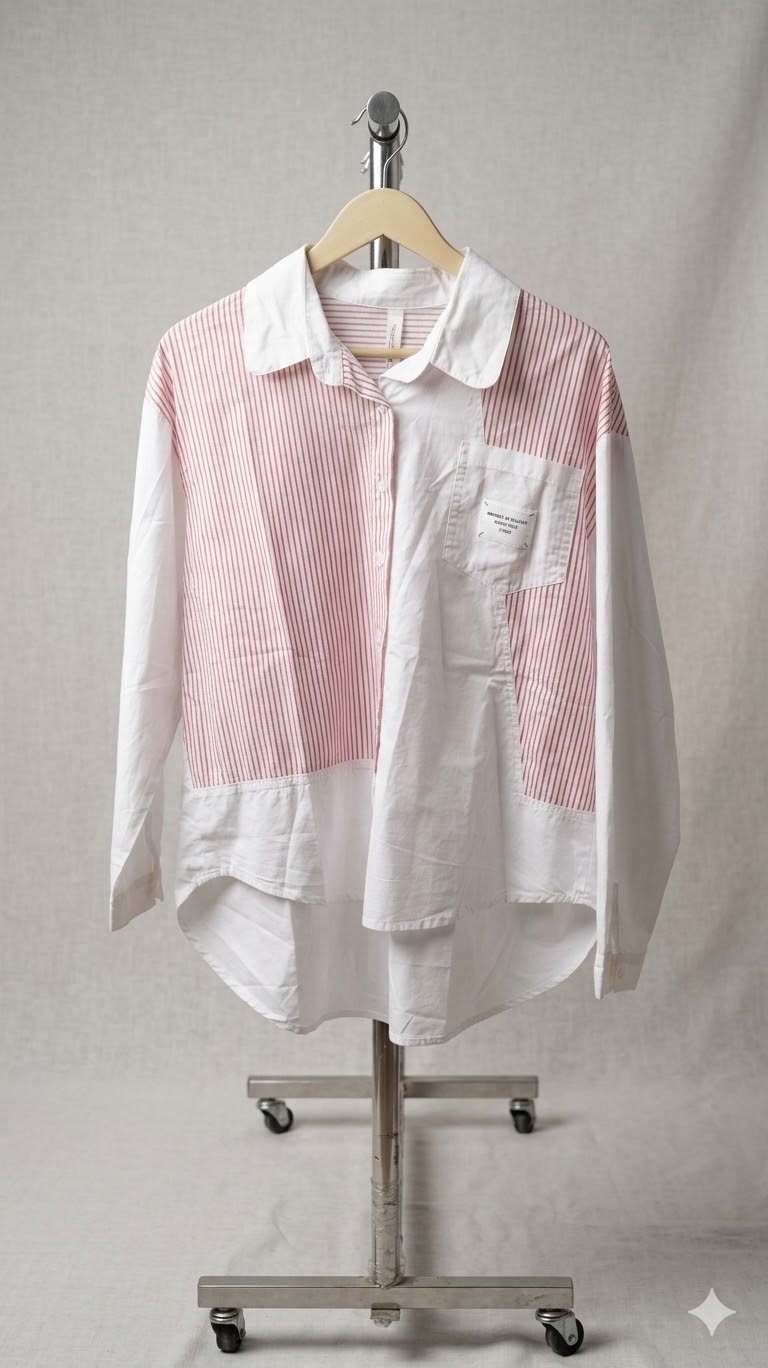 Women’s Premium Red and White Striped Patchwork Shirt with Asymmetric High-Low Hem and Front Pocket Detail