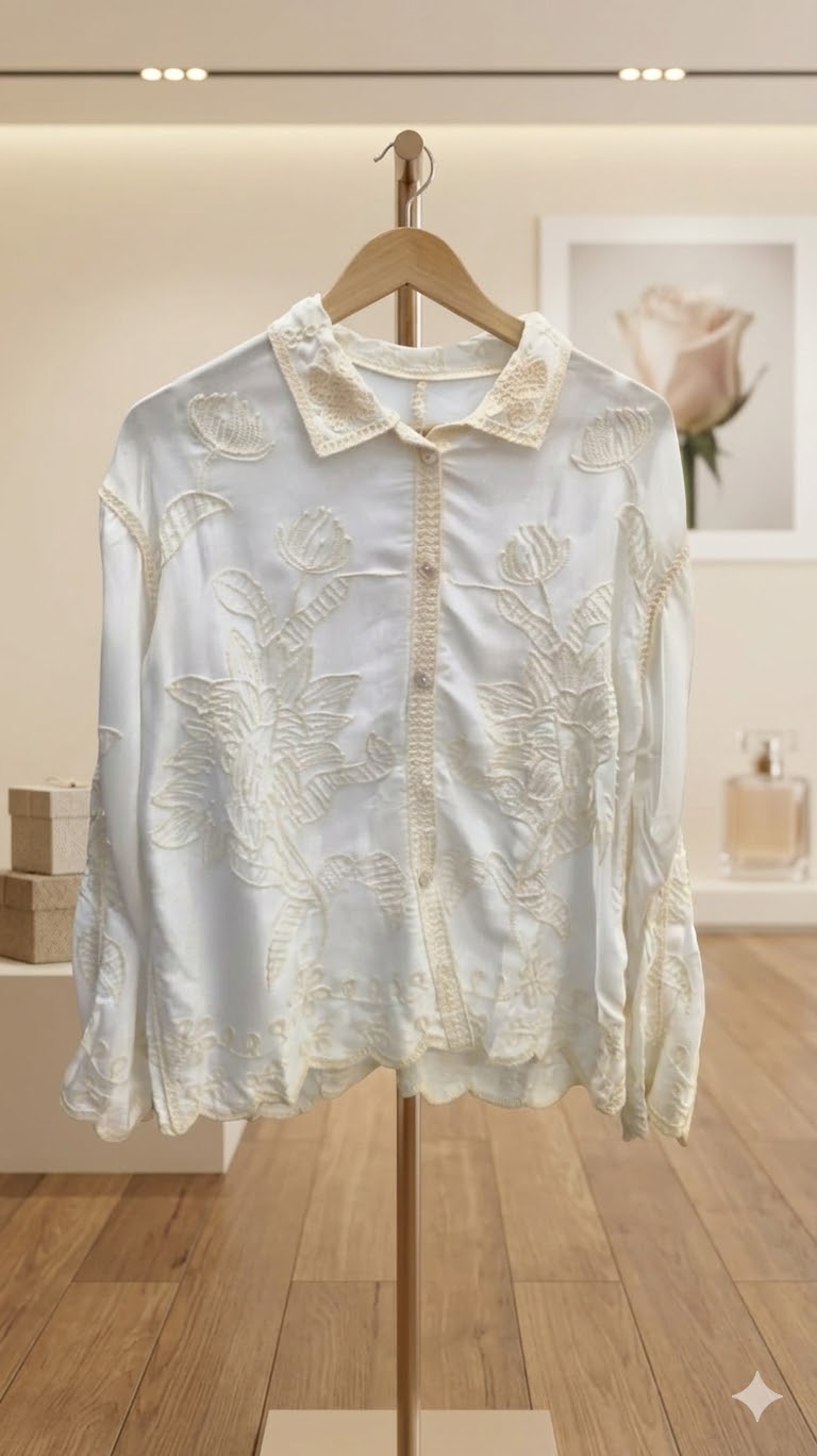 Women's White Long Sleeve Floral Embroidered Shirt with Scallop Edge
